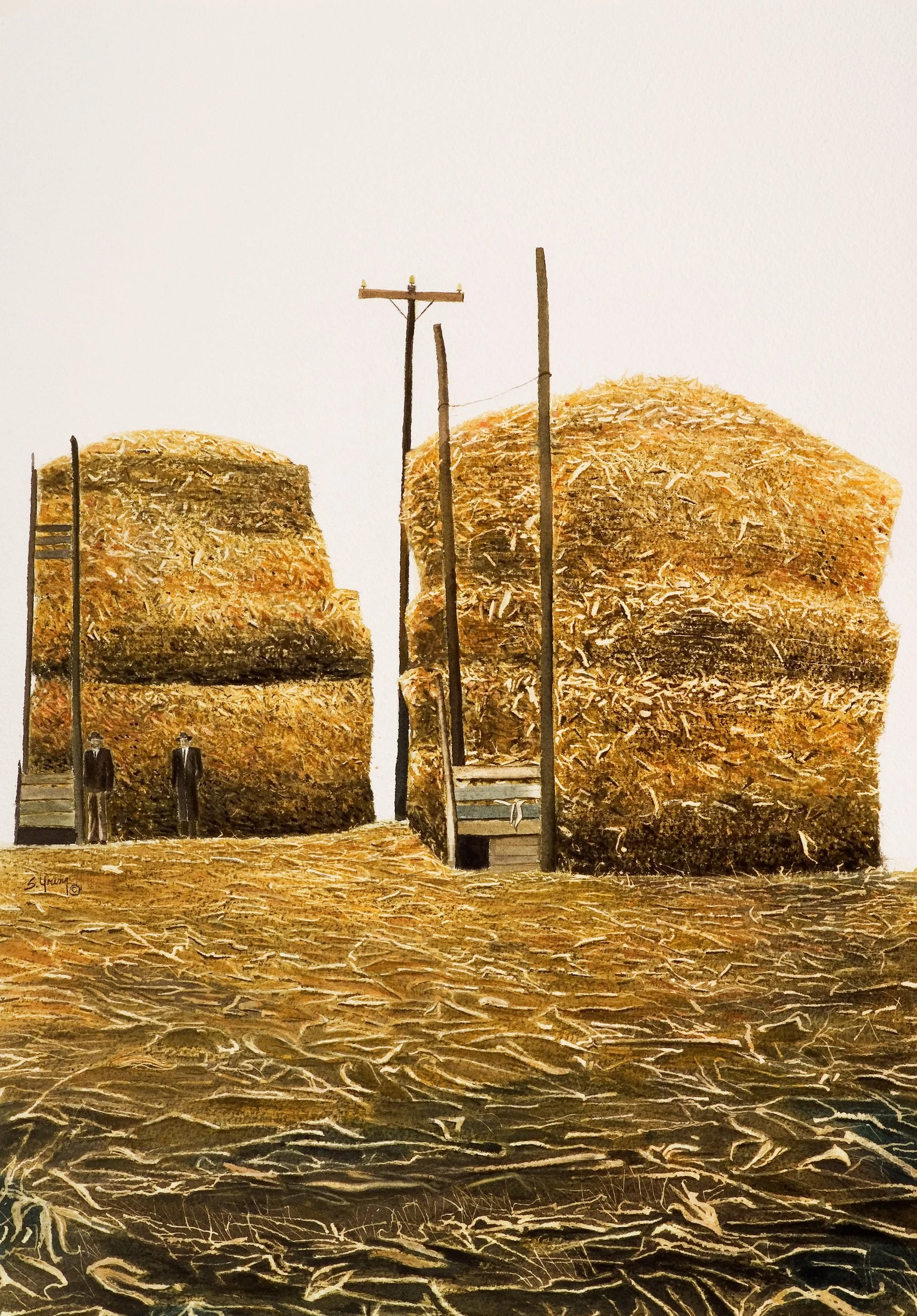 Grandpa and Dad stand proud and tall in front of their bountiful corn harvest after a Sunday meal. This corn rick was a crude grain storage method: as each wire ring was filled, another ring was added. It became the spark of inspiration for Dad’s inventive mind and his future grain storage company.