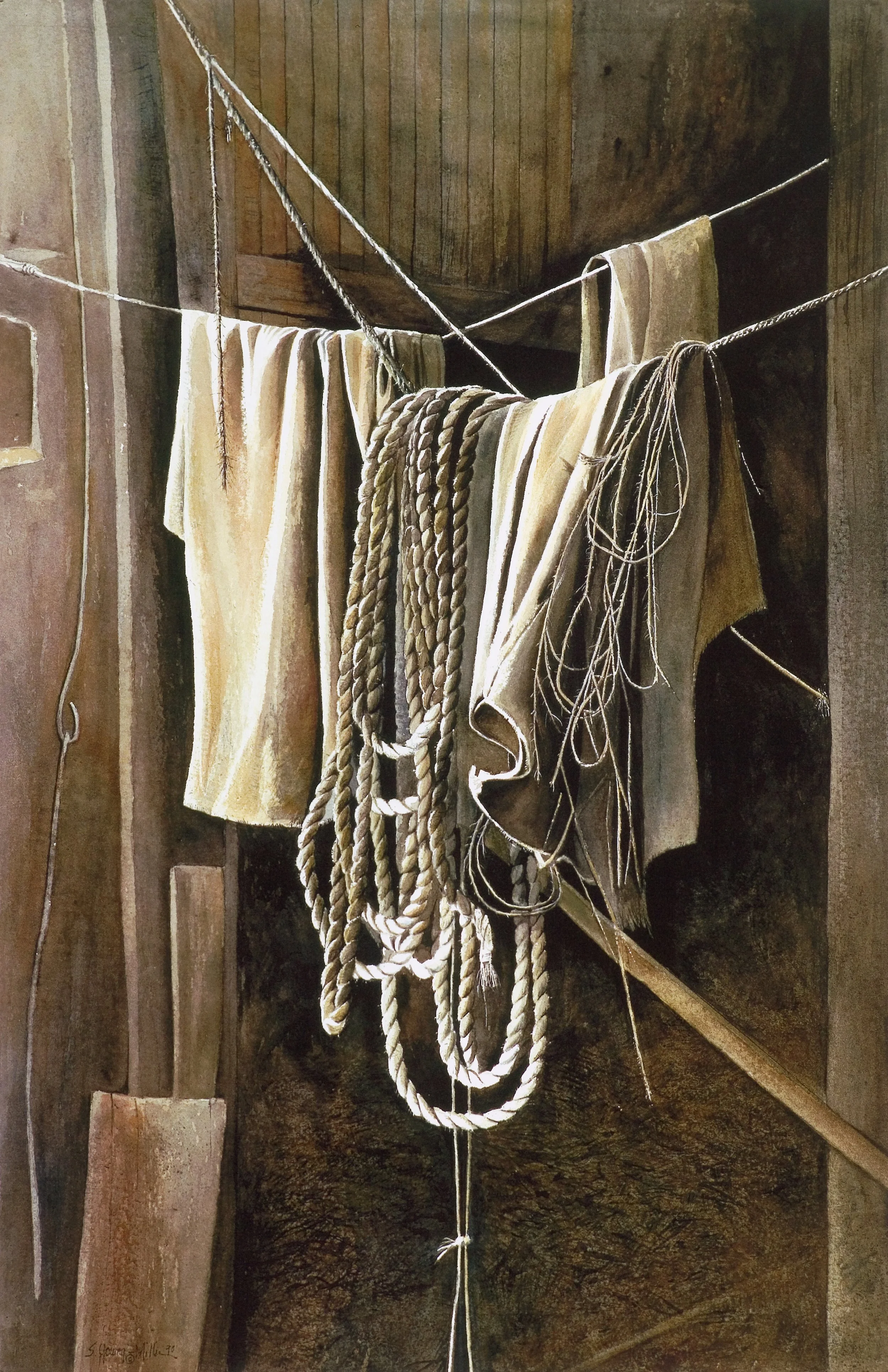 Gunnysacks, twine, and ropes were always draped, ready for use on the farm. These barn drapes are just a few of many farm necessities, used over and over—simple, basic recycling farm principles. Dad hung ropes and farming gear on huge spikes in our barn. Whoever used the rope last was responsible for coiling it and returning it to its rightful place; a missing rope was a useless rope.