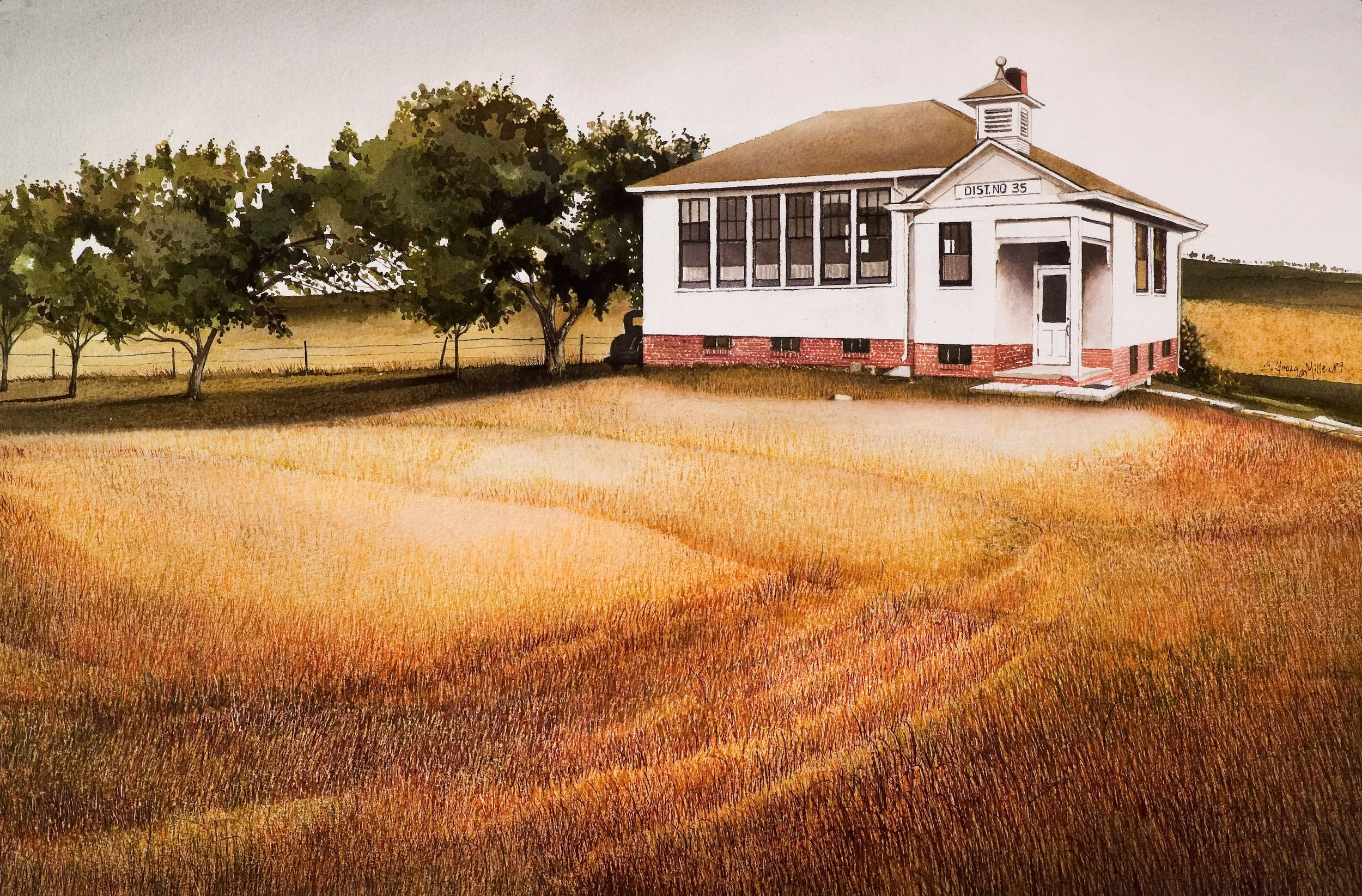 Mother attended Midland Lutheran College to fulfill her dream of becoming a schoolteacher. This is the country school near her childhood farm where she taught. Mother’s college classes had stressed sight-reading, but when it didn’t work with her students, she reverted to the phonics system she had been taught as a child. Her students responded instantly to. The tracks in this painting symbolize different paths and life lessons, all intertwined. the old, logical phonics method. She discovered keeping things simple and at an intuitive level opened her students’ channels to learning.
