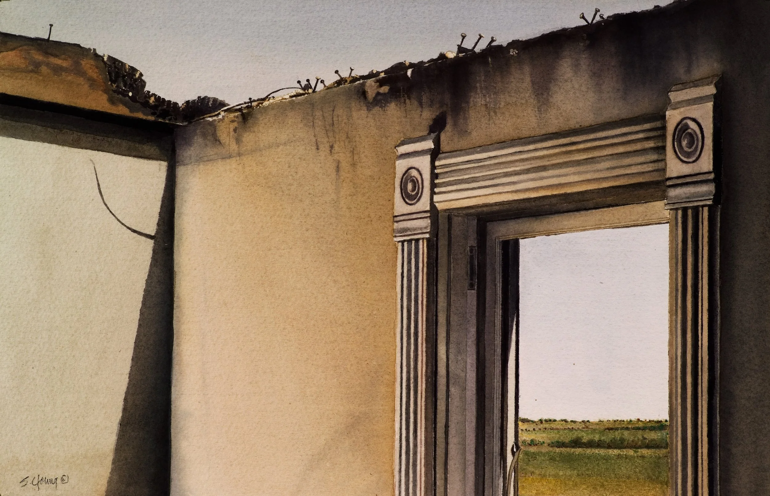 Through the burned-out roof, the fire revealed an inner sacred world, releasing the whispers and secrets contained within. Sunlight pours in, exposing the inside, brightening and healing any lingering shadows. Secrets held in the girls’ room are now free.