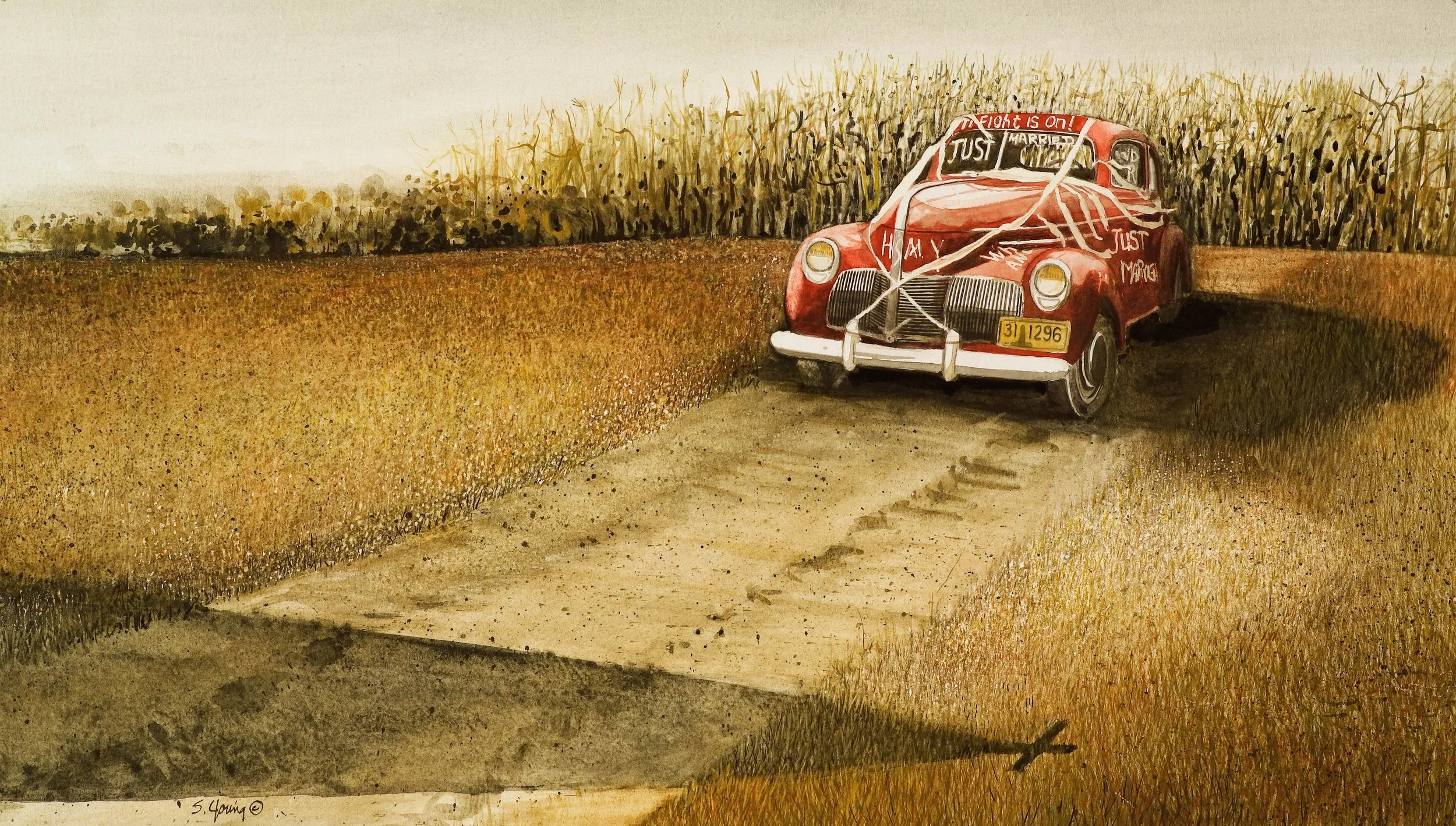 The symbolic red wedding car in this painting is part of a fun, but fading tradition. Celebrating festively, the young male pranksters tied cans on the car, wrapped it with toilet paper, and wrote strange graffiti on it. The odd words, “The fight is on,” were accepted and understood—couples in those days knew that all marriages had challenges. Their mindset was that they would be able to work through all of their issues and stay together.