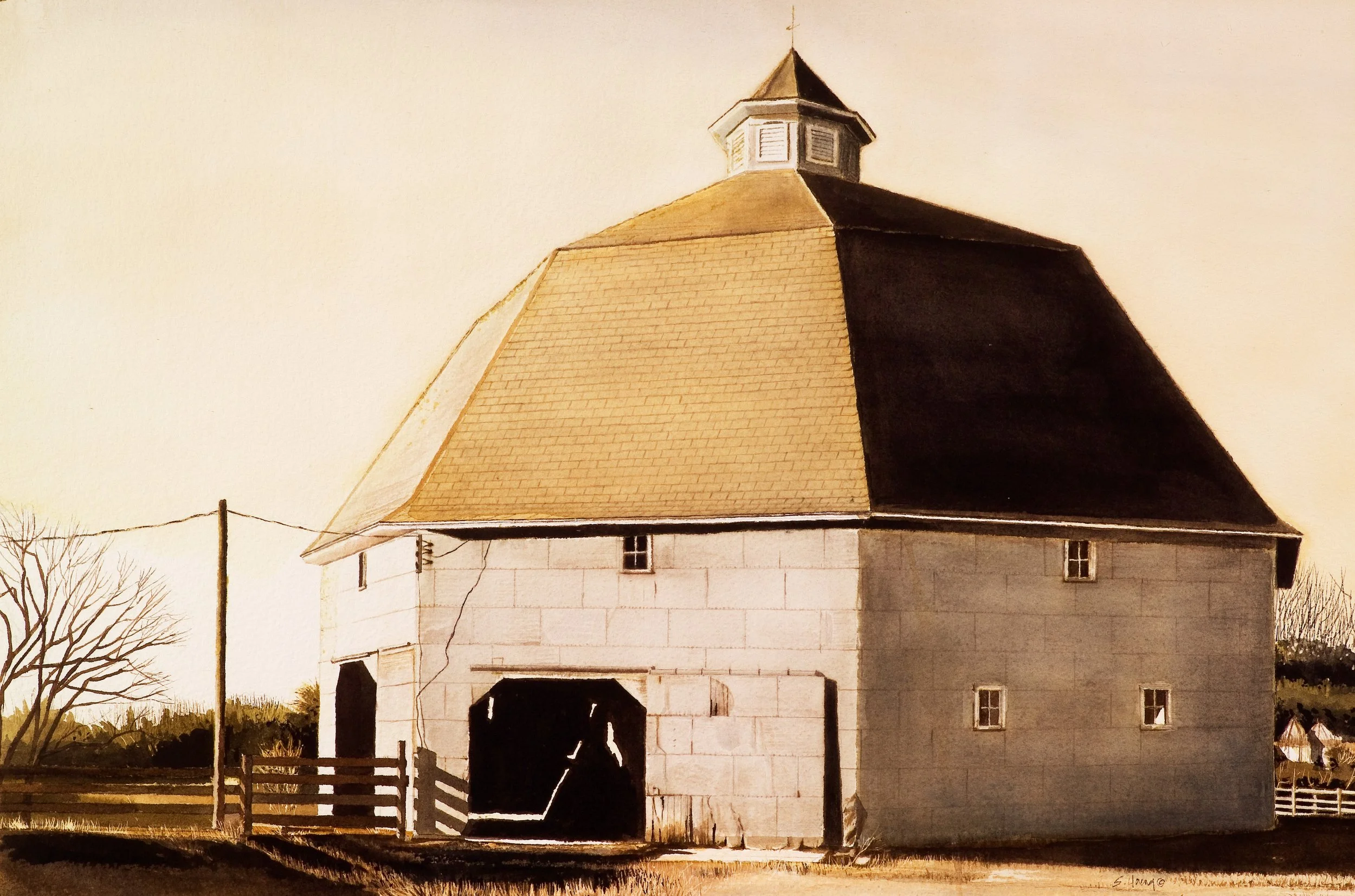 Even though they were rare, round, multisided barns like this were thought to make more efficient use of space than conventional rectangular barns. Failed barn structures of the past taught the farmers to reshape their barn interiors to withstand the strong, forceful winds of the plains.